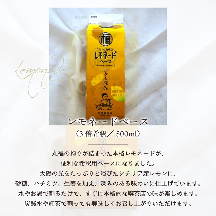 | レモネードベース(100ml当たり) | カロリー:185kcal、炭水化物:47.8g、たんぱく質:0.3g、食塩相当量:0.004g、脂質:0mg |