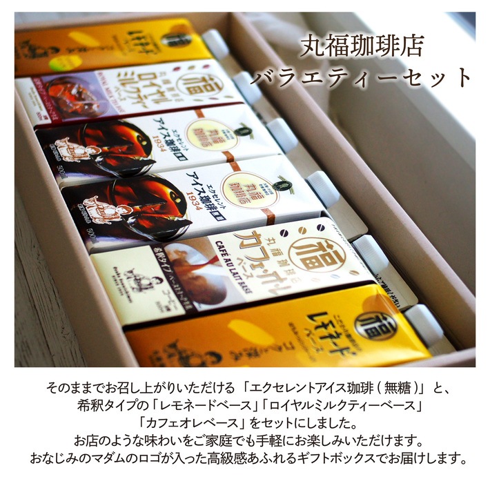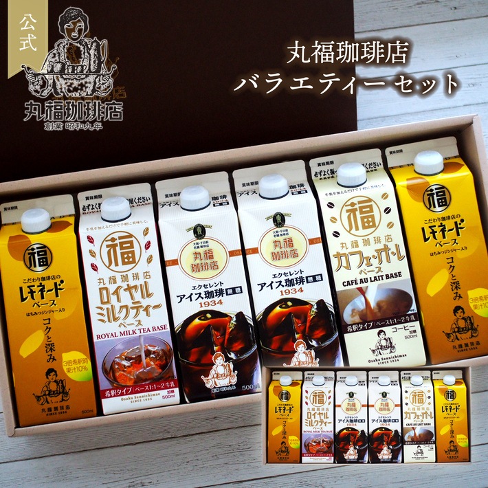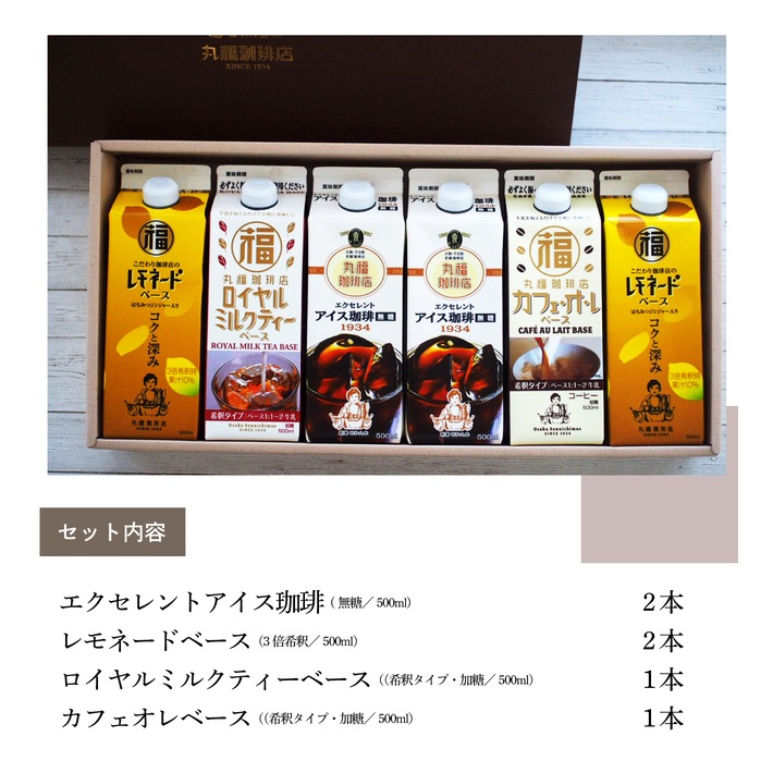 | 内容量 | 【エクセレント珈琲】500ml×2本【レモネードベース】500ml×2本【カフェ・オ・レベース】500ml×1本【ロイヤルミルクティーベース】500ml×1本 |