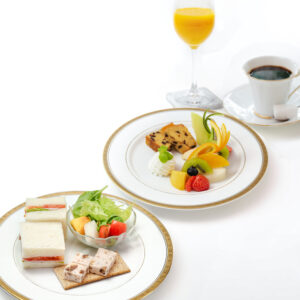 サンドウィッチやフルーツサラダ、自家製パテのクラッカーのグランドデッシュやパウンドケーキやフレッシュな季節の果物がのったセカンドデッシュ🍊