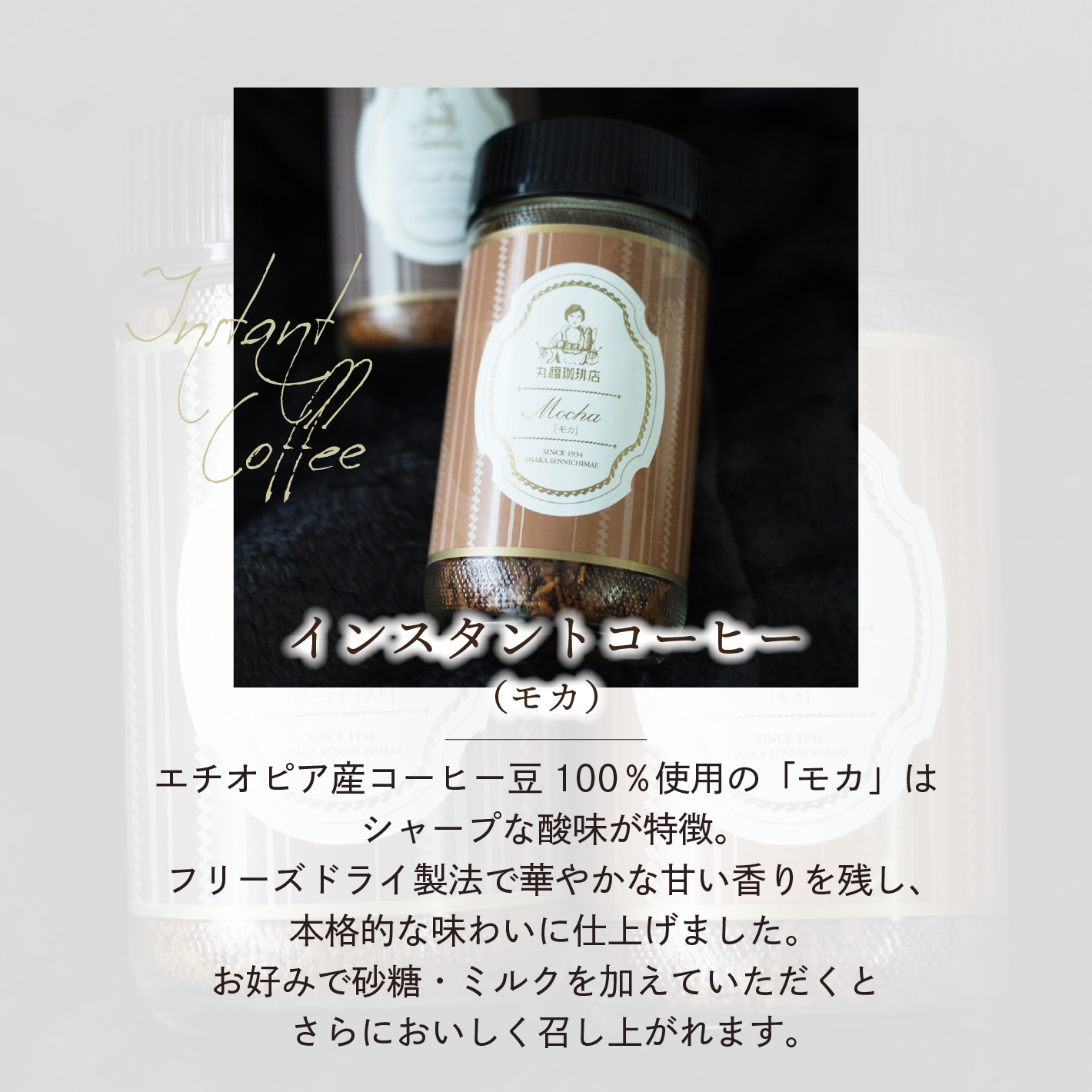 エチオピア産モカ100%を使用した、丸福珈琲店のオリジナルインスタントコーヒーです。フリーズドライ製法によってシャープな酸味と華やかな甘い香りを残し、インスタントでありながら本格的な味わいに仕上げました。