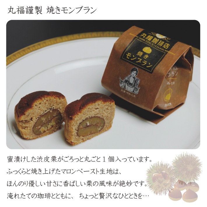 蜜漬けした渋皮栗が丸ごと1個入っています。ふっくらと焼き上げたマロンペースト生地は、ほんのり優しい甘さに香ばしい栗の風味が絶妙です。