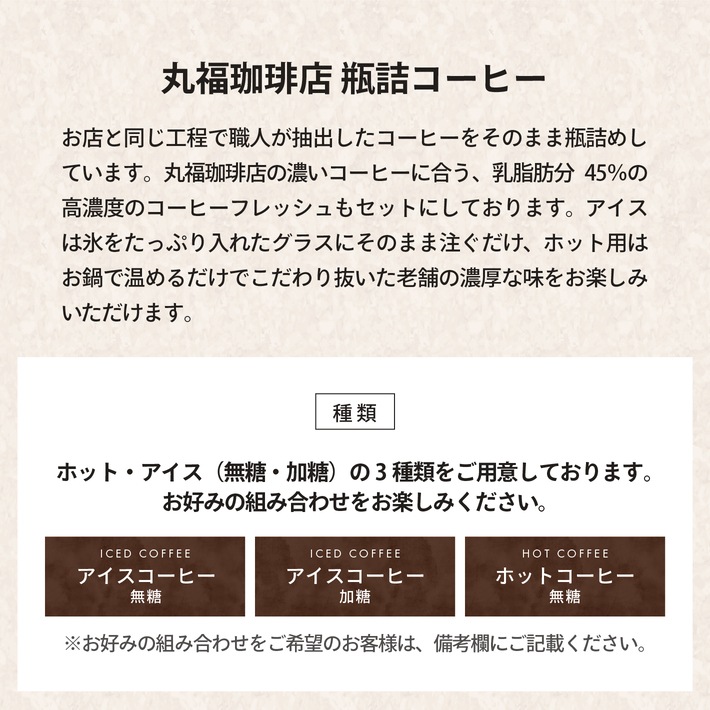 | 内容 | 瓶詰コーヒー4本(コーヒーフレッシュ4個付)、名物プリン6個 |