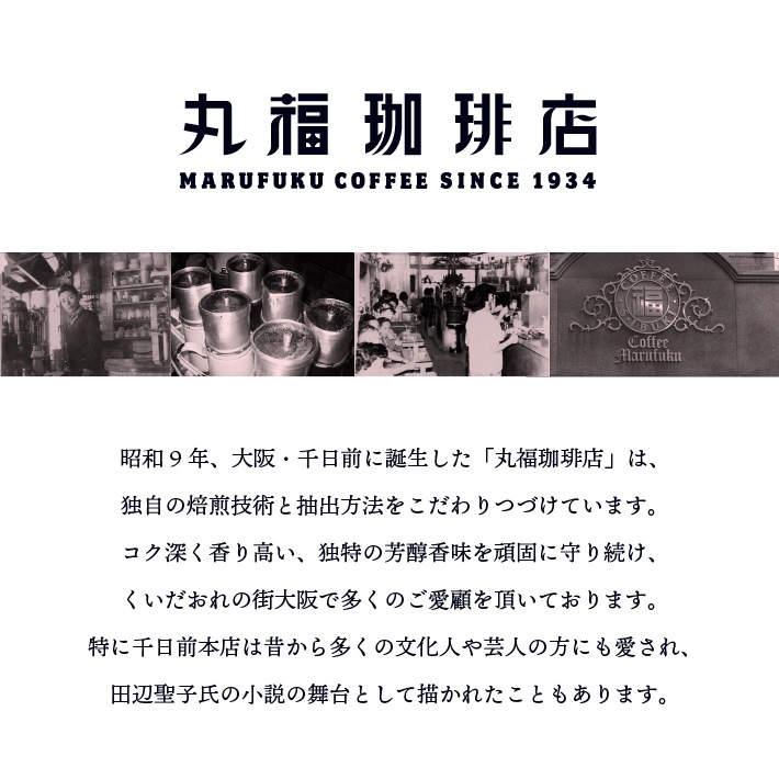 昭和九年創業の丸福珈琲店のお取り寄せは、90年に渡って守り続けてきた「深煎りの極み」と称される濃厚な本格コーヒーをご家庭でも味わっていただけるよう製品化したものです。