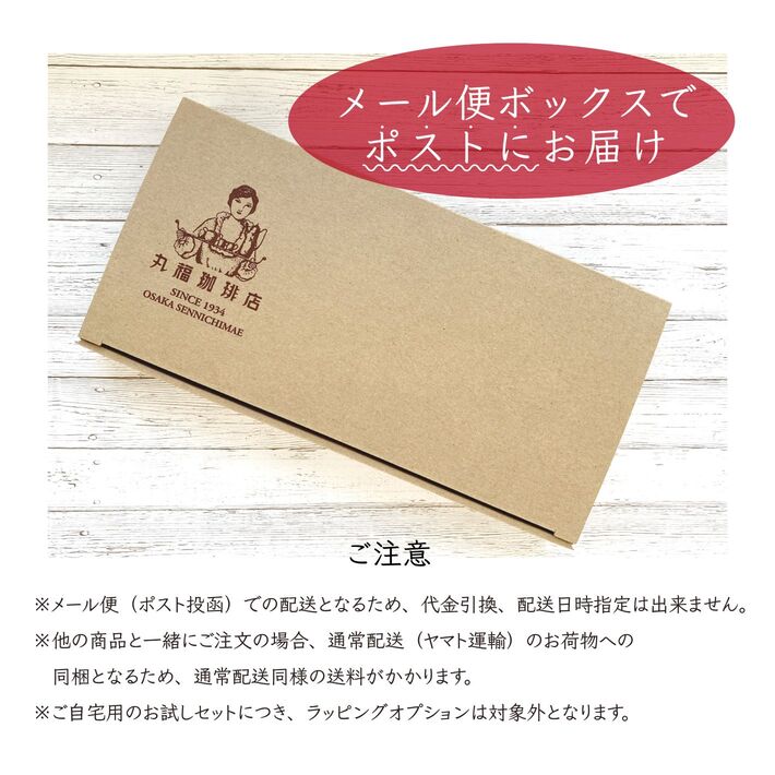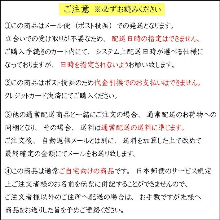 ※メール便(ポスト投函)での配送となるため、代金引換、配送日時指定は出来ません。
