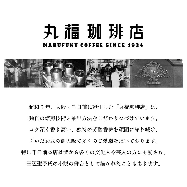 昭和九年創業の丸福珈琲店のお取り寄せは、90年に渡って守り続けてきた「深煎りの極み」と称される濃厚な本格コーヒーをご家庭でも味わっていただけるよう製品化したものです。